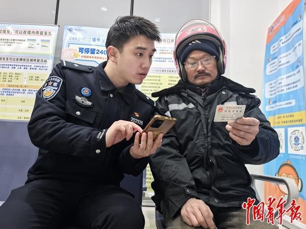 2月7日晚,在启东边检站执勤一队办证服务窗口,移民管理警察现场指导登轮作业人员在手机上办理上下外国船舶许可手续。中青报·中青网记者 何春中/摄