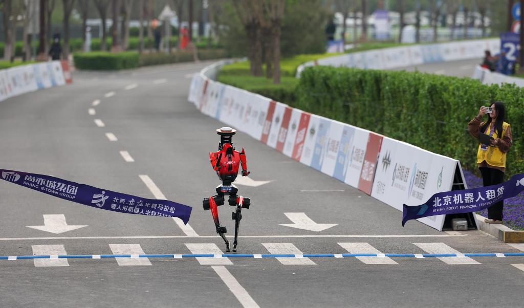 4月19日,2026北京亦庄半程马拉松暨人形机器人半程马拉松在北京亦庄举行。齐天大圣队自主人形机器人选手“闪电”在比赛中冲线。新华社记者 张晨霖 摄