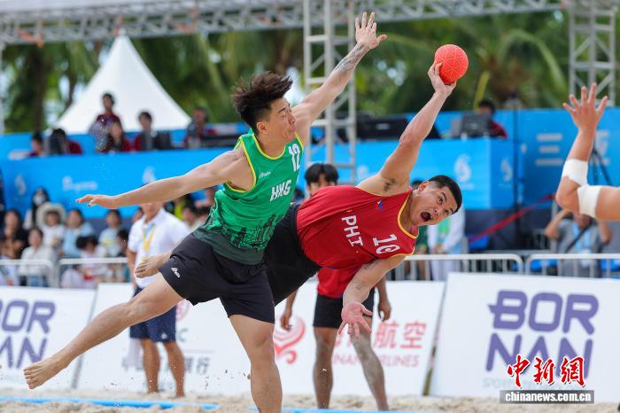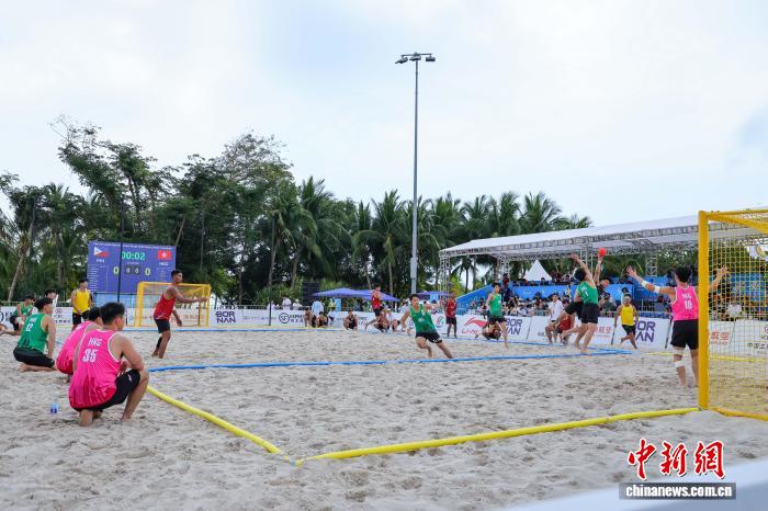 4月21日,在海南省三亚市进行的第六届亚洲沙滩运动会沙滩手球男子小组赛中,菲律宾队以2比0战胜中国香港队。图为双方球员在比赛中。 记者 骆云飞 摄