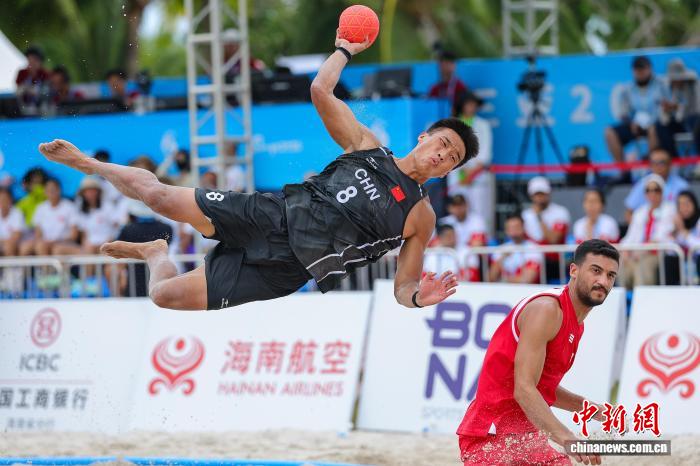 4月21日,在海南省三亚市举行的第六届亚洲沙滩运动会沙滩手球男子小组赛中,中国队0比2不敌巴林队。图为中国队球员马会锋(左)在比赛中射门。 记者 骆云飞 摄