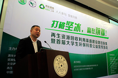 北京市天龙天天洁再生资源回收利用有限公司总经理刘权作了规范的回收渠道是再生资源循环利用的关键的主旨发言。刘权认为:“(再生资源回收产业发展面临的问题)本质上是新的体系建设运行与灰色产业链既得利益的矛盾”,这些问题有些本可以利用现有法规通过执法解决,但由于执法不严或缺位,这些矛盾严重影响体系建设及运行。他建议,应将再生资源回收体系建成全民参与的生态文明体系,把回收体系作为城市垃圾管理的组成部分来建设运行。建立固废排放流向监控机制及数据体系,为精细化管理提供数据支撑。同时明确公益性质,政府购买服务。加强执法体系,对破坏环境的灰色产业链实施强约束。