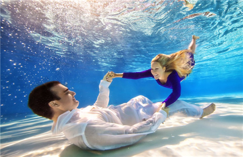 想要拍出别出心裁的订婚照吗?尝试在水下进行拍摄吧。来自佛罗里达的摄影师Adam Opris专门为订婚情侣们在水下拍摄订婚照。情侣们身穿设计师的华服,完全沉入水中,或浪漫拥吻,或搞笑摆拍。看似普通的造型在清澈荡漾的水波中,效果格外梦幻。