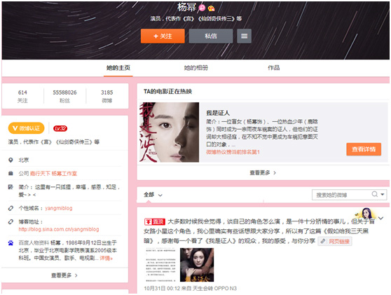 事实上,在杨幂此前主演的影视剧中,如此卖力的宣传实属少见。就连《小时代》上映时,她也只是象征性在微博上进行了推荐,大热的《何以笙箫默》播出时,也未见她大规模微博声援。而在《我是证人》上映当天,杨幂就在微博上发表长文,袒露心扉与观众分享自己首度出演盲人的感受与体悟,随后还向圈内好友打招呼,力邀范冰冰、黄晓明、何炅、王俊凯、冯绍峰、周笔畅、叶一茜等好友帮忙,甚至不惜与“撕破脸”多年的“旧爱”胡歌回关,请他帮忙宣传电影。
