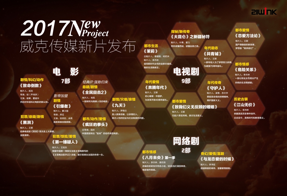 2017年威克传媒将以优质内容生产为核心,凭借从IP孵化,项目开发,影视制作,宣传发行,打造经纪团队,依托公司庞大资源优势,实现院线电影、电视剧、超级网剧的全面爆发,为中国影视行业的可持续性发展贡献力量。