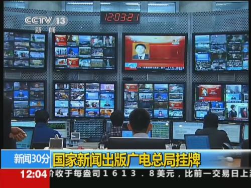 3月22日上午9点,国家新闻出版广电总局的揭牌仪式在原“国家广播电影电视总局”门口举行。国家新闻出版广电总局局长、党组副书记、国家版权局局长蔡赴朝(左)和国家新闻出版广电总局党组书记、副局长蒋建国揭牌后鼓掌。