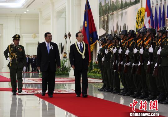 温家宝出席柬埔寨首相举行的欢迎仪式