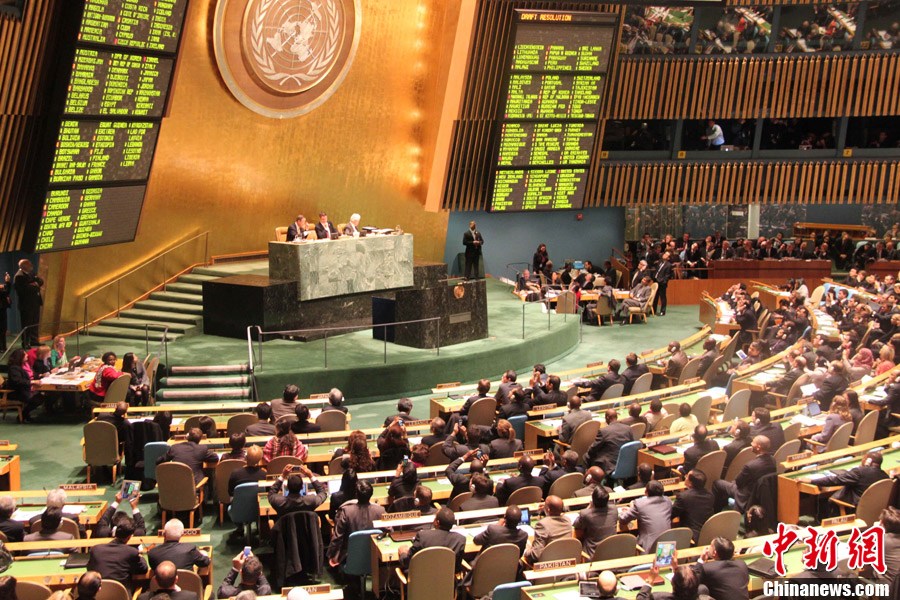 41票弃权通过决议,决定在联合国给予巴勒斯坦观察员国地位。