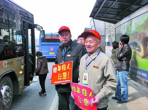 15日早上7时30分许,郑州市建设路与桐柏路交叉口一处公交站牌附近,20多位头戴红帽的老年人志愿者发出了“给年轻人让座”的倡议。