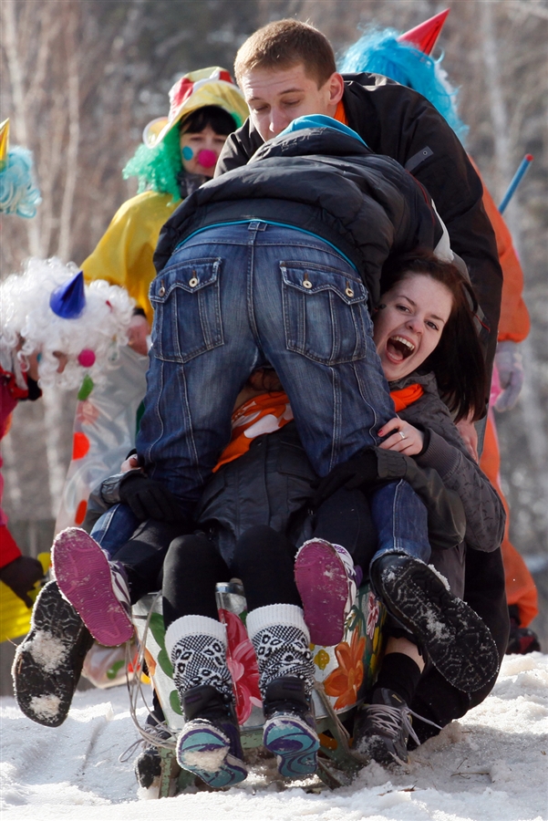 当地时间2013年3月30日,为庆祝愚人节和冬季运动赛季的结束,俄罗斯克拉斯诺雅茨克举行第八届滑稽平底雪橇滑雪赛,大约有80人参加了比赛