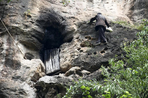 21日下午1点多,在洞穴下等待了1个小时后,封明山背着一个袋子回来了。记者向他打招呼,他一语不发,只是不停地笑。不一会儿,背着袋子的他就爬到了最高的洞穴旁,手扒岩壁脚踩着峭壁上的许多小洞,飞檐走壁一般就进了他在峭壁上的山洞“卧室”。