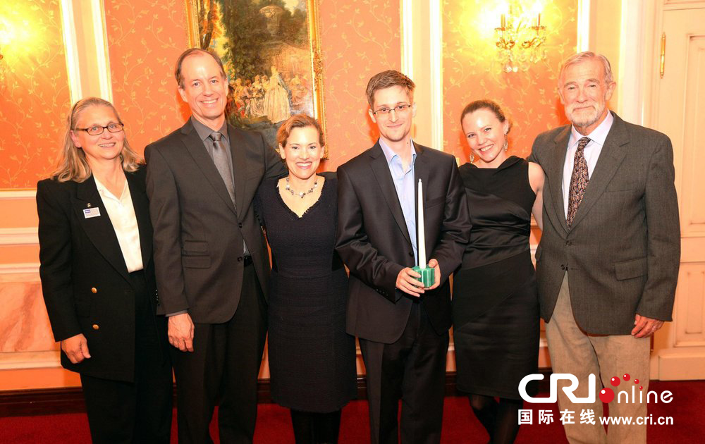 当地时间2013年10月9日,美国棱镜门爆料者斯诺登在莫斯科领取萨姆亚当斯情报诚信协会奖,陪同他一起领奖的是维基解密的英国籍记者。