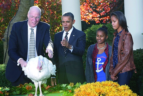 11月27日,在美国首都华盛顿,美国总统奥巴马(中)带着他的两个女儿萨沙(左)、玛莉娅(右)在感恩节火鸡赦免仪式上讲话。当日,美国总统奥巴马在白宫举行一年一度的感恩节火鸡赦免仪式,一只名叫“爆米花”的火鸡连同它的同伴,一只名叫“焦糖”的火鸡,一道获得了当年的总统感恩节“特赦”。