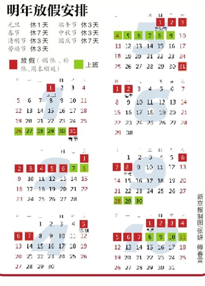 新京报讯(记者郭超)昨晚,国务院办公厅发布《关于2014年部分节假日安排的通知》。明年全年假期依然维持11天不变,春节、五一和国庆通过调借相邻周末形成长假,其余假日都是“赶上哪天放哪天”。值得一提的是,春节放假从农历正月初一开始,这与以往除夕就开始放假有所不同。