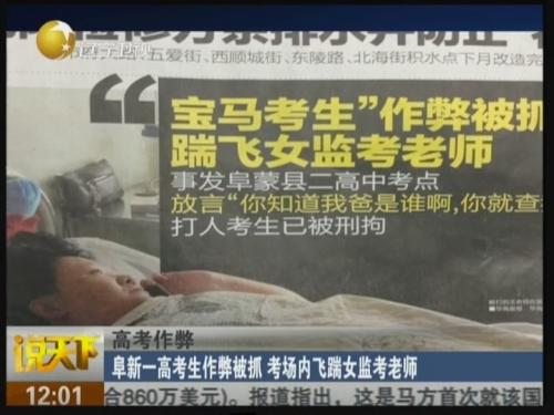 6月8日上午,阜新一开宝马轿车参加高考的男性考生考场作弊被抓,为泄愤从背后飞脚将监考老师踹飞并连补几脚。
