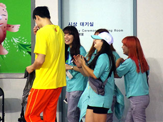 2014年9月18日,韩国仁川,2014年仁川亚运会前瞻,孙杨现身游泳馆引女粉丝疯狂追捧。