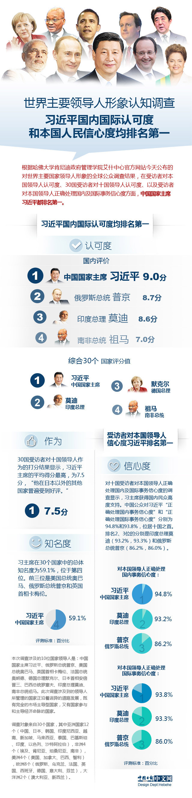 根据哈佛大学肯尼迪政府管理学院艾什中心官方网站今天公布的对世界主要国家领导人形象的全球公众调查结果,在受访者对本国领导人认可度、30国受访者对十国领导人认可度、以及受访者对本国领导人正确处理国内及国际事务信心度方面,中国国家主席习近平都排名第一。