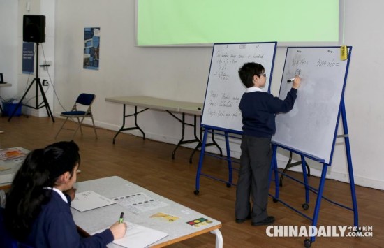 3月17日,在英国伦敦东北部埃塞克斯郡的哈里斯小学,一名三年级(相当于国内二年级)的小学生在白板上用竖式计算。