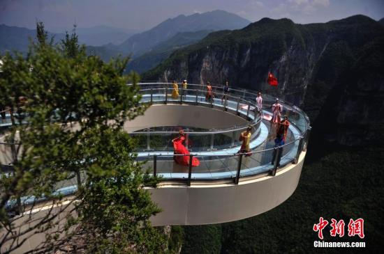 4月26日上午,世界最长玻璃悬挑廊桥――云阳云端廊桥正式对外开放。世界顶级飞人miles(迈瑞思)和中国第一飞人徐凯在廊桥上同时挑战低空跳伞。