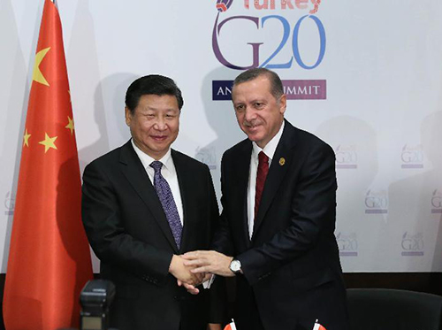 埃尔多安表示,欢迎习近平主席来土耳其出席二十国集团峰会。土中两国保持密切高层和各领域交往,有助于增进相互理解、促成共识,对推动两国关系深入发展十分重要。土方高度重视对华关系,愿在相互尊重基础上,继续同中方深化政治、经济、能源、文化、安全、旅游等各领域合作,并同中方一道努力,提高两国贸易水平。土方愿积极参加“一带一路”框架下合作,欢迎中国企业加大对土耳其基础设施等领域投资。土方决不允许任何势力在土从事反华和破坏土中关系的活动。