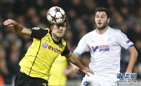 12月11日,多特蒙德队球员帕帕斯塔索普洛斯(左)在比赛中拼抢。当日,在2013-2014赛季欧洲足球冠军联赛F组最后一轮比赛中,德甲多特蒙德队客场以2比1战胜法甲马赛队。 新华社/路透