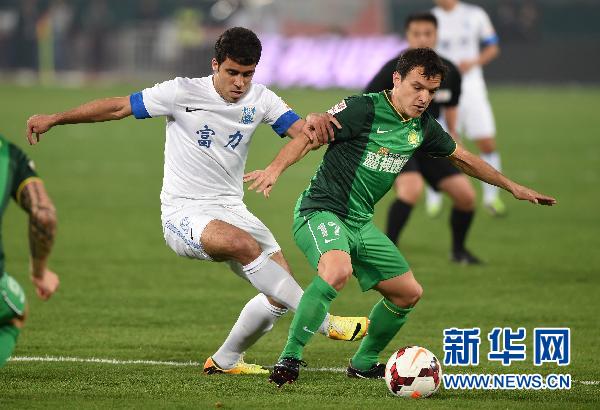 4月7日,北京国安队球员巴塔拉(右)在比赛中控球。当日,在2014赛季中国足球超级联赛第5轮比赛中,北京国安队主场以2比0战胜广州富力队。 新华社记者李俊东摄
