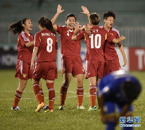 5月15日,中国队球员庆祝得分。当日,在越南胡志明市举行的2014女足亚洲杯B组比赛中,中国队以7比0战胜泰国队。 新华社记者何靖嘉摄
