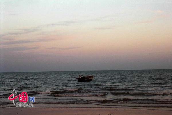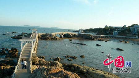 兴海湾南端有“三礁揽胜”,在起伏绵亘的三座盘踞海中的明礁上,建有一座造型幽雅的观海亭,一曰“雪浪亭”,一曰“迎霞亭”,各亭之间栈桥相连,真可谓是“三礁石恋大曲桥,百皱岩戏千重浪”。桥上游人来往不绝,或登亭观潮听浪,或依亭背海摄影,或蹲礁静心垂钓,真可谓各得其所,各离其乐。倘若赶上落潮,“三礁揽胜”里侧的海水退却海滩半隐半露,还可拾贝、捉蟹,更是乐趣横生。