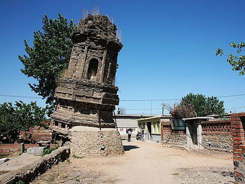 前卫歪塔又名瑞州歪塔,建于北魏(资料),距今已有1000多年的历史。前卫斜塔是一座实心密檐式砖塔,石筑塔基,砖砌塔身,分三级呈八角八面形,每个侧面宽2米。塔身有砖刻佛像、花纹、狮子头等图案,刀法精湛,线条极其清晰。现存塔高约10米(顶部残缺)。歪塔塔座为须弥式,束腰部分有砖雕花卉。每面三条斗拱,托起勾栏平座。平座面上雕有“卍”字纹、卷云纹及莲花,再往上为莲座。塔身建于莲座之上,以叠设法逐层而起。东西南北四个正面全都修有券门,为佛龛。佛龛两侧雕卷草纹。其余四面,雕莲蓬图案。塔身每面两侧均雕有角柱,柱顶有普柏枋相连。其上起斗拱,以挑起塔檐。