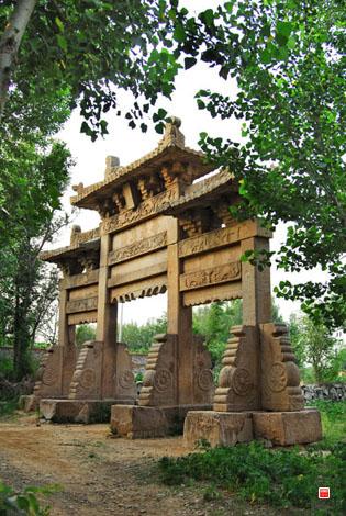 在石牌坊村南,有一对华表,绿树掩映的两座高大石坊,四柱四间,三楼式,单檐庑殿顶。此坊立于明崇祯十年(1637年),是皇帝为总兵官后军都督府朱梅(字海峰)因镇守山海关有功而赐立的。