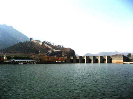 九门口长城,因其城桥下有九个泻水城门而得名,水势自西向东直入渤海,气势磅礴、壮观,是自然景观和人文景观的完美结合,因而享有“水上长城”的美誉,2002年被联合国教科文组织评为中国东北地区唯一的世界文化遗产。包括明长城隧道,点将台,烽火台,敌楼,哨楼,碧云寺,一片石,箭岛,围城,珍禽观光园等景点。 九门口长城始建于北齐(公元479-502年),扩建于明初1381年。明 代以前,这里是重要的军事关口。九门口长城全长1704米,是中国万里长城中唯一的一段水上长城,其跨河墙长达100多米。九江河水从城下的九道水门直流而过,“城在山上走,水在城下流”,景色壮观。