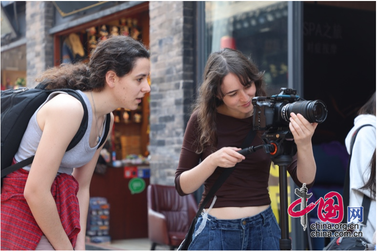 那些山西人日常穿行其间的古建筑、抬眼可见的窗花、习以为常的传统服饰,悄然成为外国青年导演们不辞辛劳、长途奔袭的审美动力。西班牙青年导演丹妮拉(Daniela)对平遥古城中随处可见的传统服饰产生了极大兴趣。在摄影师王生梁的建议下,丹妮拉与希腊导演穆托尔(Myrto)、厄瓜多尔导演鲁比(Ruby)欣然换上了中国传统服饰。更富意味的是,丹妮拉在街巷中偶遇了一位与她一样身着传统服饰的外国友人——这一刻,不同国籍、不同文化背景的人们因中华传统服饰而相遇,成为中华文化以美动人、影响世界的微缩景观。