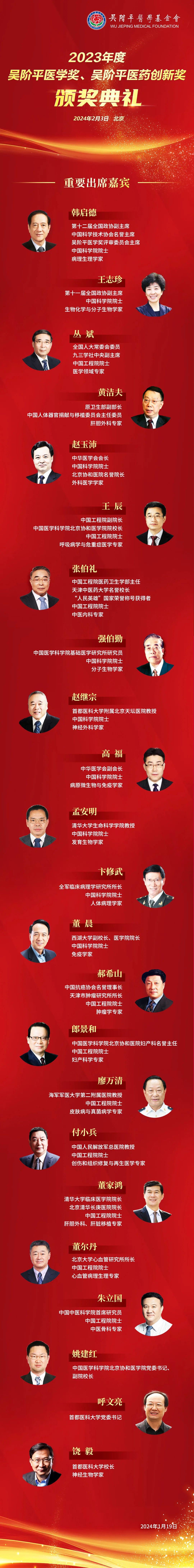2023年度吴阶平医学奖、吴阶平医药创新奖颁奖典礼将于2024年2月3日在中国医学科学院北京协和医学院壹号礼堂举行。