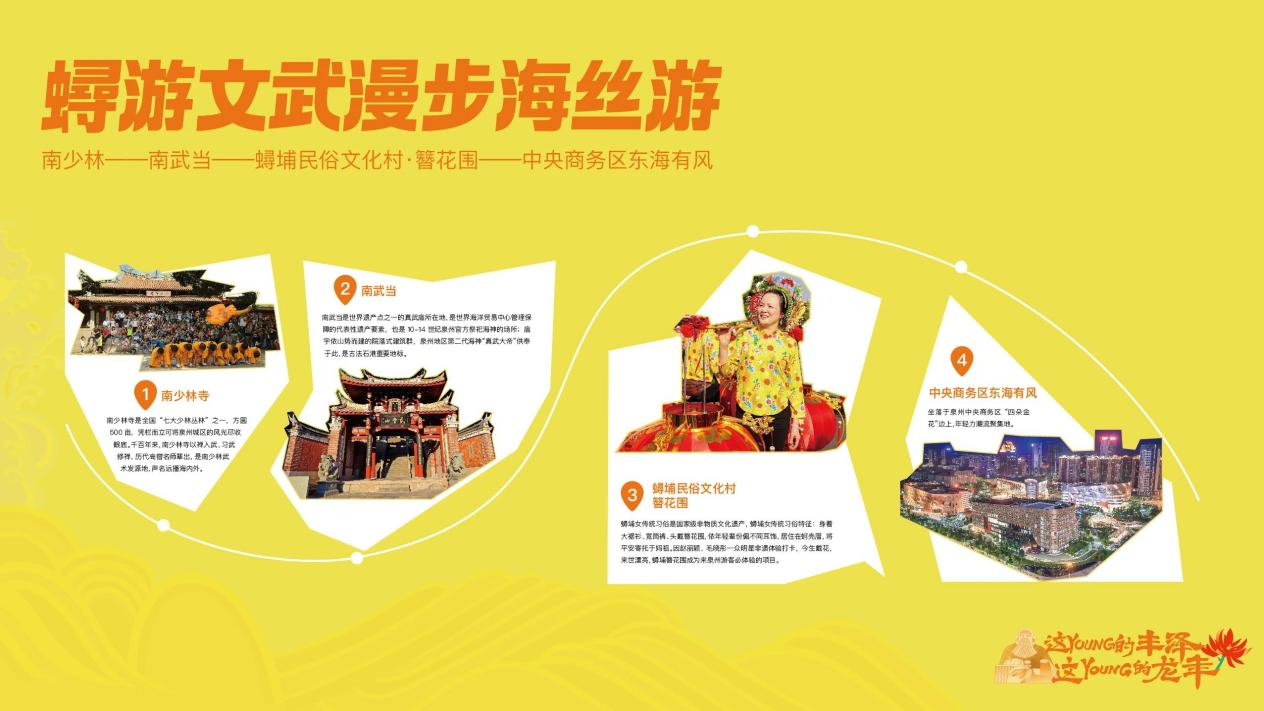 第一条路线:蟳游文武漫步海丝游 南少林——南武当——蟳埔(簪花围)——中央商务区东海有风。