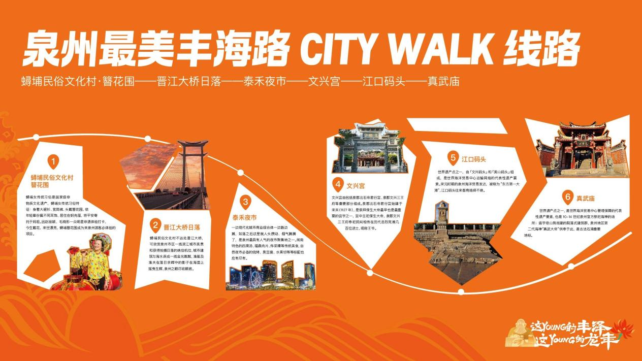 第二条路线:泉州最美丰海路City Walk线路 蟳埔民俗文化村·簪花围——晋江大桥日落——泰禾夜市——文兴宫——江口码头——真武庙。