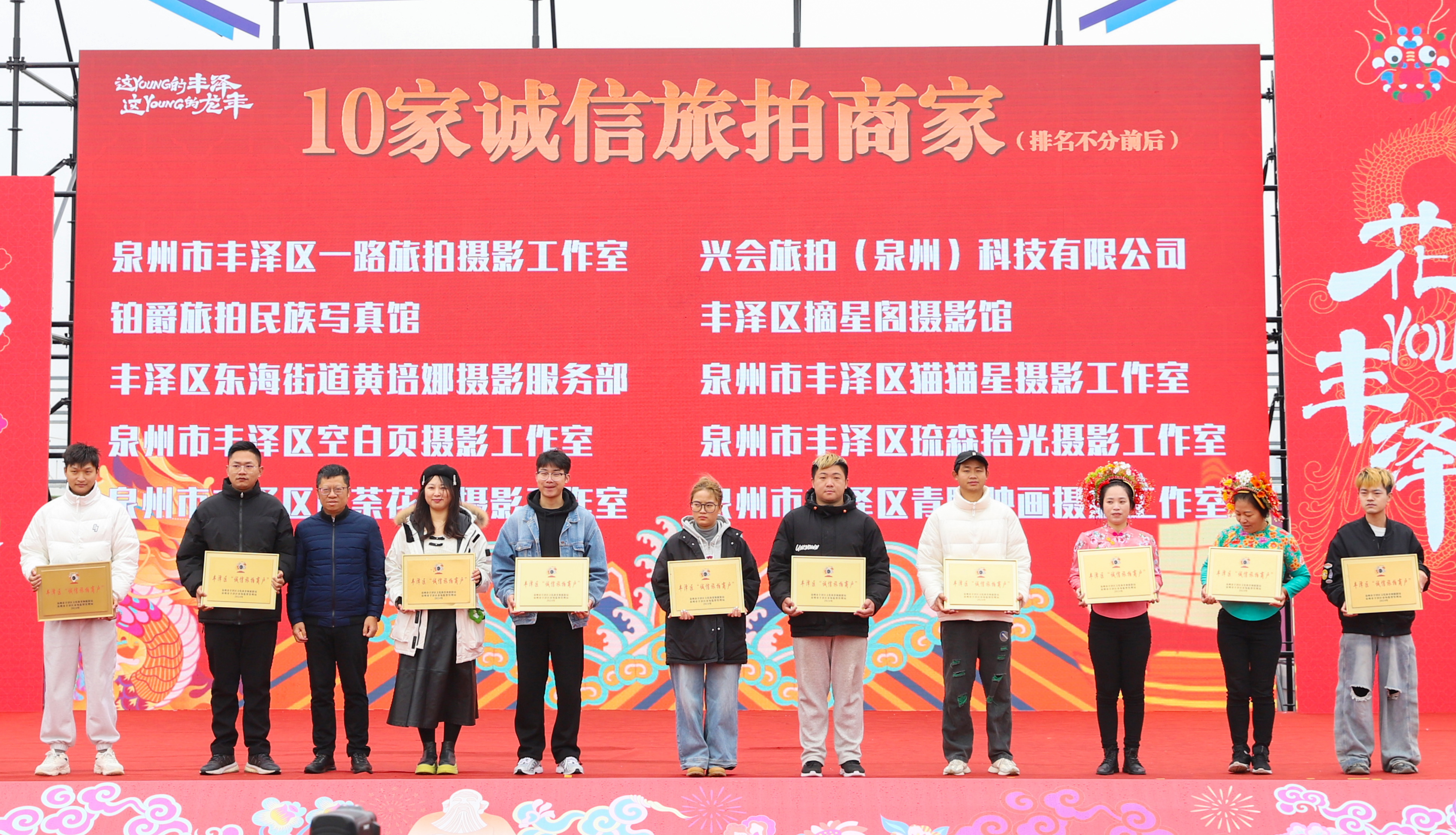 泉州市丰泽区一路旅拍摄影工作室、兴会旅拍(泉州)科技有限公司、铂爵旅拍民族写真馆、丰泽区摘星阁摄影馆、丰泽区东海街道黄培娜摄影服务部、泉州市丰泽区猫猫星摄影工作室、泉州市丰泽区空白页摄影工作室、泉州市丰泽区琉森拾光摄影工作室、泉州市丰泽区山荼花开摄影工作室、泉州市丰泽区青野映画摄影工作室等10家“诚信旅拍商户”,将带头肩负起“文明经营、放心消费”的社会责任,树立丰泽的旅游服务样板,努力为游客打造优质的服务场景,留住那每瞬间的美好体验。