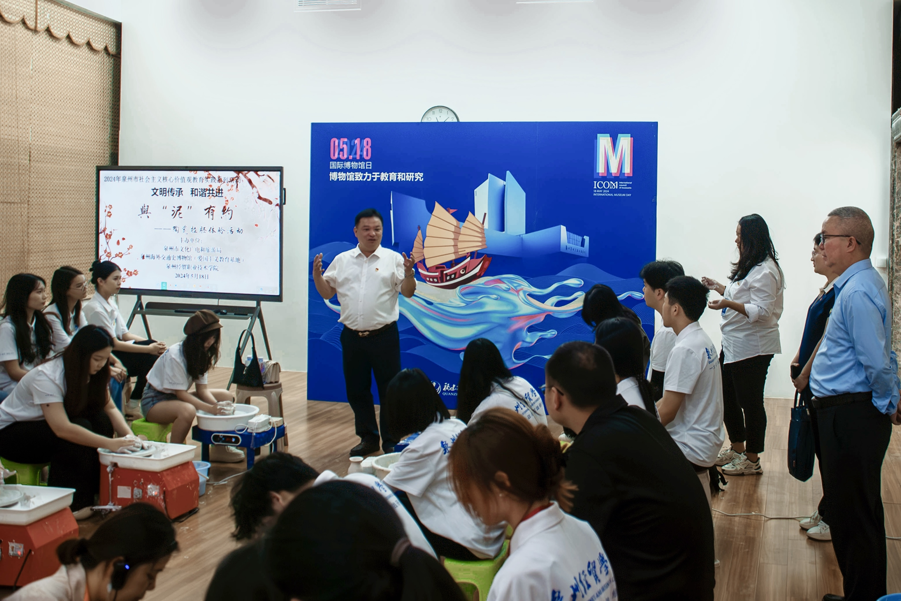 在“与‘泥’有约”——陶瓷拉胚体验活动中,廖伏树以陶瓷文化主题,引导学生结合陶瓷拉胚体验,认知体会陶瓷制作技艺的复杂和艰深,真切感受匠人精神,为师生带来精彩的“场馆里的思政课”。