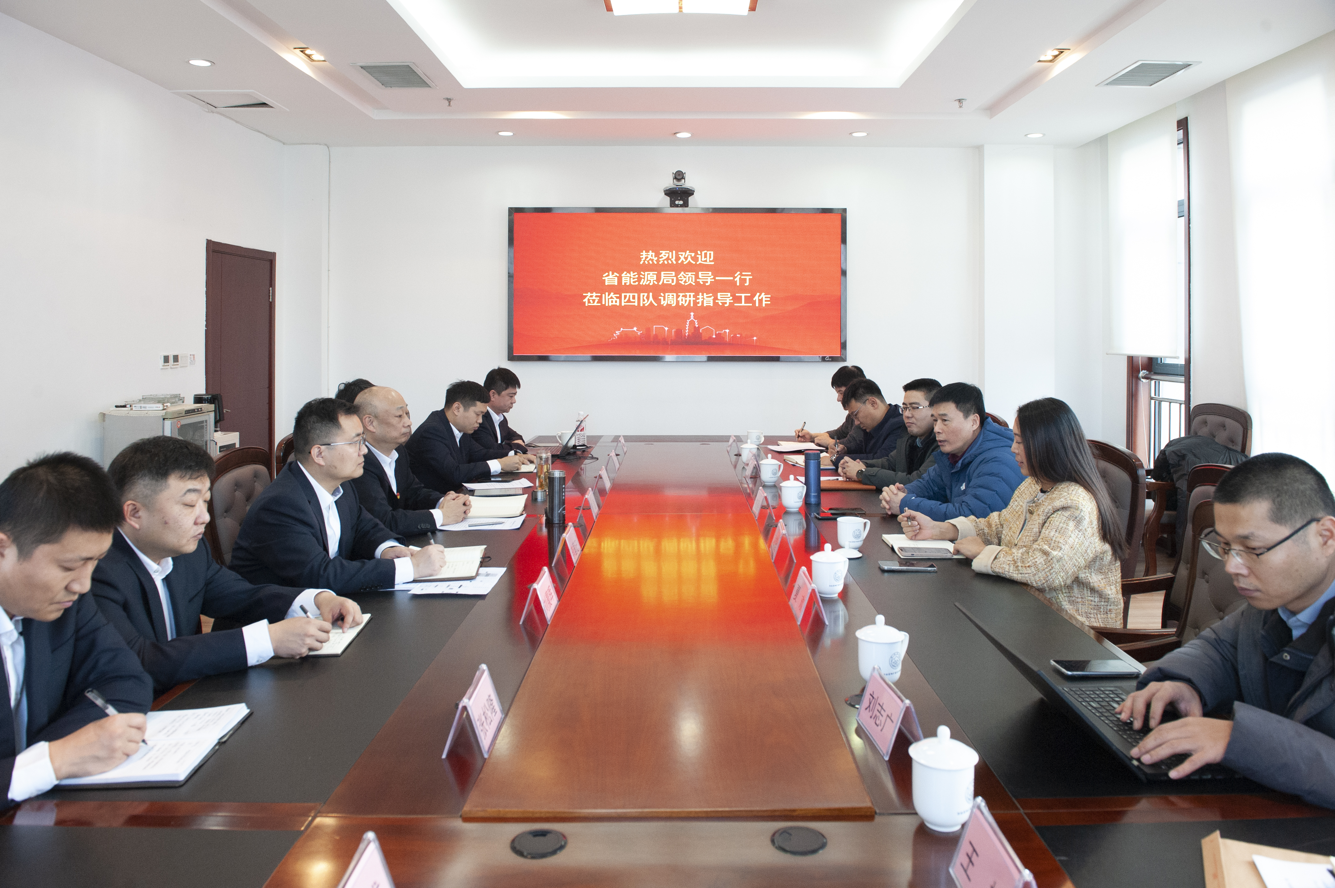 为扎实推进围场满族蒙古族自治县农村能源革命试点县建设,12月20日,河北省能源局到河北省地矿局第四地质大队(以下简称“地质四队”)调研座谈。河北省发展改革委员会二级巡视员、河北省能源局副局长檀通州,塞罕坝生态文明创新研究院秘书长赵宇红,中国南水北调集团新能源投资有限公司华北分公司总经理张凯戈、投资部主任孙文烨,通标标准技术服务有限公司高级技术经理刘志广、商务经理夏欢,北辰集团董事长张勇、运营部经理王楠,地质四队副队长李国记、王伟出席会议。会议由地质四队队长曹磊主持。