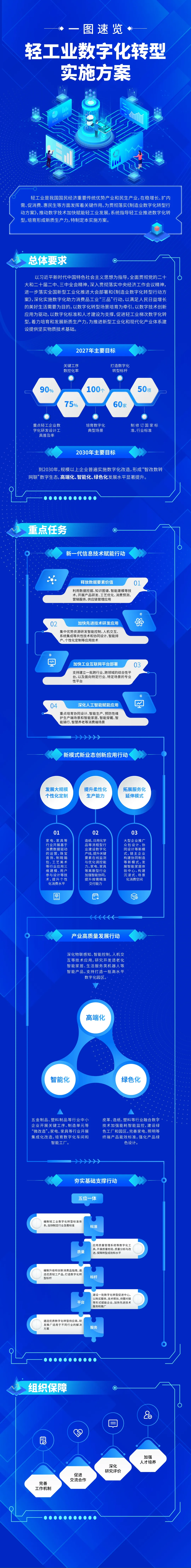 《实施方案》提出两步走发展目标:到2027年,重点轻工企业数字化研发设计工具普及率达到90%左右,关键工序数控化率达到75%左右,打造100个左右典型场景,培育60家左右标杆企业,制修订50项左右国家和行业标准,形成一批数字化转型成果。到2030年,规模以上企业普遍实施数字化改造,形成“智改数转网联”数字生态,高端化、智能化、绿色化水平显著提升。
