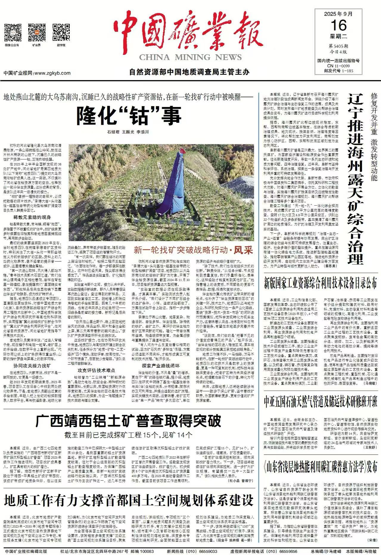 继国家级主流官方媒体报道后,近日,国家级行业报刊《中国自然资源报》《中国矿业报》分别以《隆化“钴事”》为题,报道了地质四队实现钴矿找矿突破背后的故事,《中国矿业报》更是荣登头版头条。