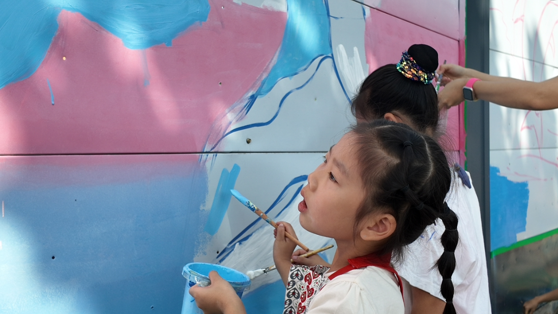 活动分为“理论讲解”与“户外实践”两大环节。讲座环节,专业美术老师围绕涂鸦彩绘艺术的起源、表现形式、色彩搭配技巧及创作逻辑展开细致讲解,结合海洋主题案例演示拆解创作难点,帮助参与者快速理解艺术创作思路;实践环节,老师带领孩子们前往中新海博酒店建筑围挡,并在上面开展绘画创作。孩子们在老师的指导下,孩子们亲身体验涂鸦彩绘这种“艺术走进公共空间”的独特乐趣,而原本单调的建筑围挡,也经由创意改造变身充满童趣与活力的“户外艺术画布”,不仅美化了周边城市环境,更成为国庆期间区域内一道别具特色的文化风景。
