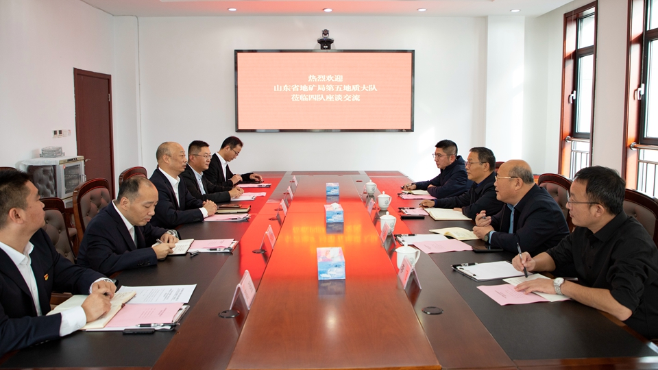 10月17日,山东省地矿局第五地质大队队长李志民,副队长徐洪岩一行到地质四队座谈交流。座谈由地质四队队长曹磊主持,总工程师苗群峰出席,办公室、总工办、矿产资源调查所相关人员,山东地矿五院地质矿产处、地质工程处相关人员参加座谈交流。