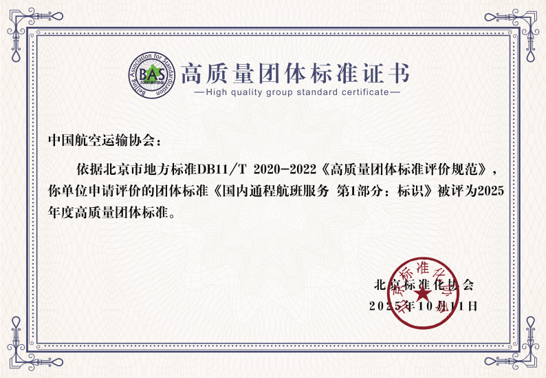 截至2025年10月中旬,中国航空运输协会共批准立项团体标准160项,已发布通用航空、航空油料、航空客货运输销售代理、民航结算、航空食品、民航客货运输信息化、旅客服务、客舱乘务、机务维修等九个领域团体标准110项,其中5项转化为行业标准,连续两年获评高质量团体标准,在规范市场主体行为、促进企业提质增效、助力行业高质量发展等方面发挥了积极作用。