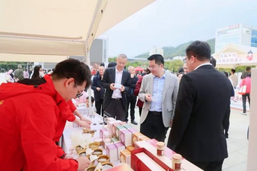 厦门市中医院党委书记蔡成福(右二)参观合作企业展示摊位