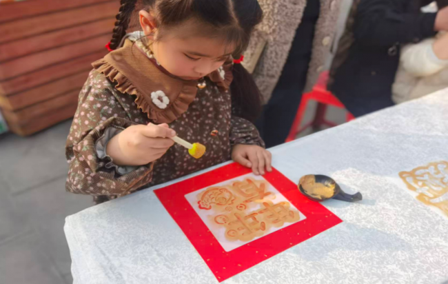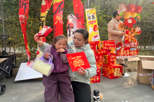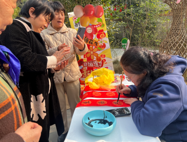 15:10起,四大核心体验环节同步升温,现场热闹非凡。春联区前,书法老师挥毫泼墨,笔走龙蛇间,一幅幅寓意吉祥的春联跃然纸上,居民们手持墨香四溢的春联,脸上洋溢着幸福笑容;套圈区人气爆棚,大家站在指定线外屏息凝神、精准投掷,欢呼声与喝彩声此起彼伏,套中的居民满载而归,尽享互动乐趣;拓印区里,志愿者耐心讲解操作步骤,居民们亲手蘸取颜料、抚平纸张,体验传统拓印技艺,感受非遗文化的独特韵味;包包DIY区创意十足,在志愿者的指导下,大家穿针引线、搭配装饰,亲手制作专属新春挎包,沉浸式享受手工创作的快乐。