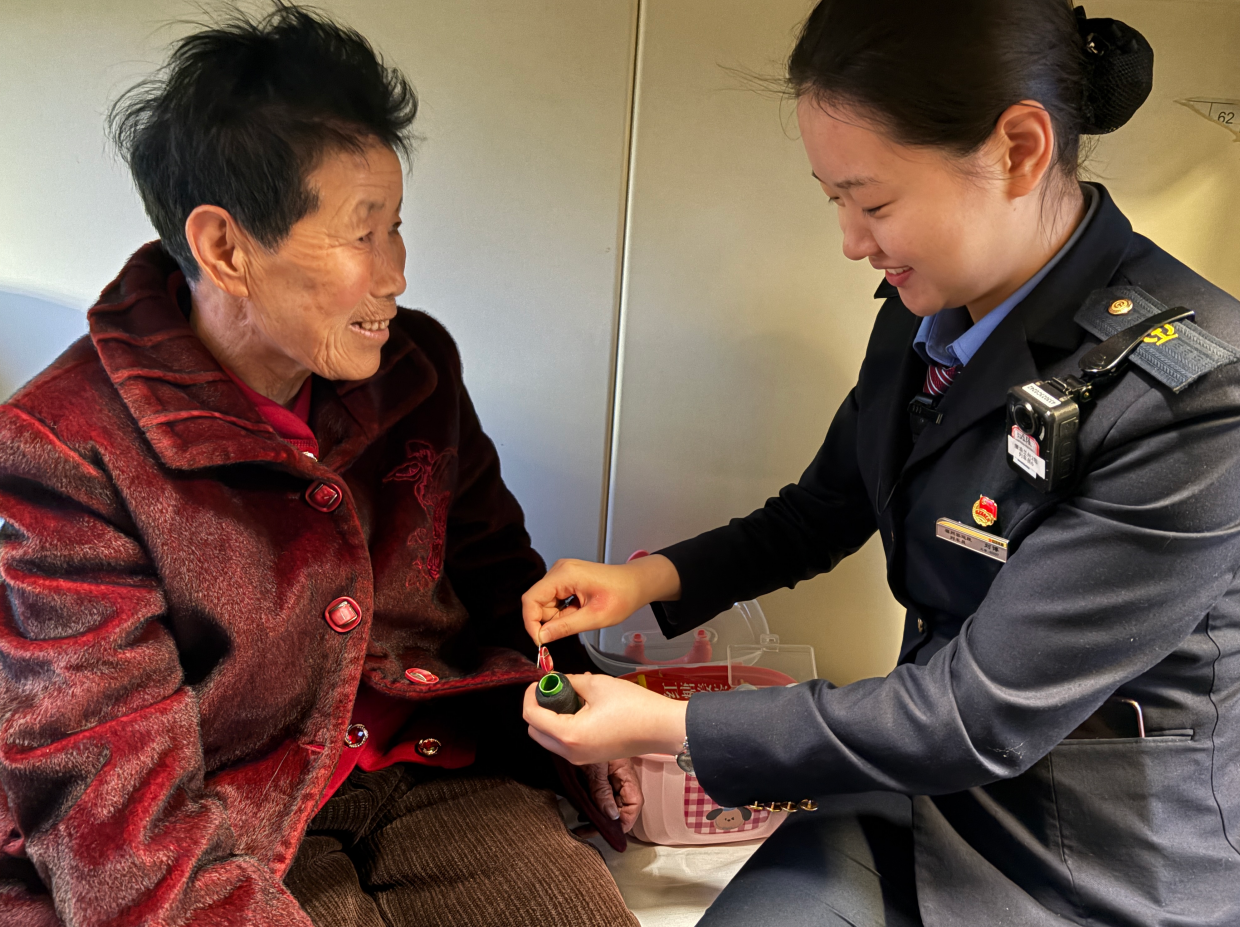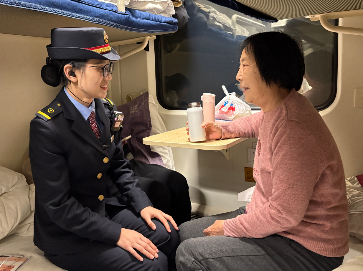 来自兰州的张大爷年过七旬,腿脚不便,且只会讲方言。一路上,列车员段娟妮成了他的“临时翻译”和贴心帮手。沟通时,段娟妮总是不急不躁,放慢语速,配上简单的手势,耐心解答每一个问题。深夜熄灯前,段娟妮特意来到张大爷铺位前提醒:“被子要盖好肩膀,有事随时叫我。”