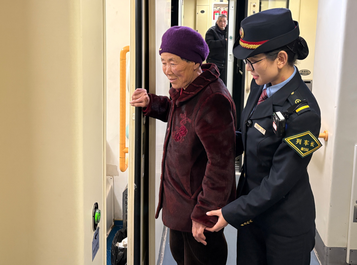 “老人家我扶您去洗手间,地上已经铺好了防滑垫,别担心。”19时38分,在车厢连接处,列车长孙文婷一手稳稳搀扶着一位老大娘,另一只手拉开了卫生间的门。