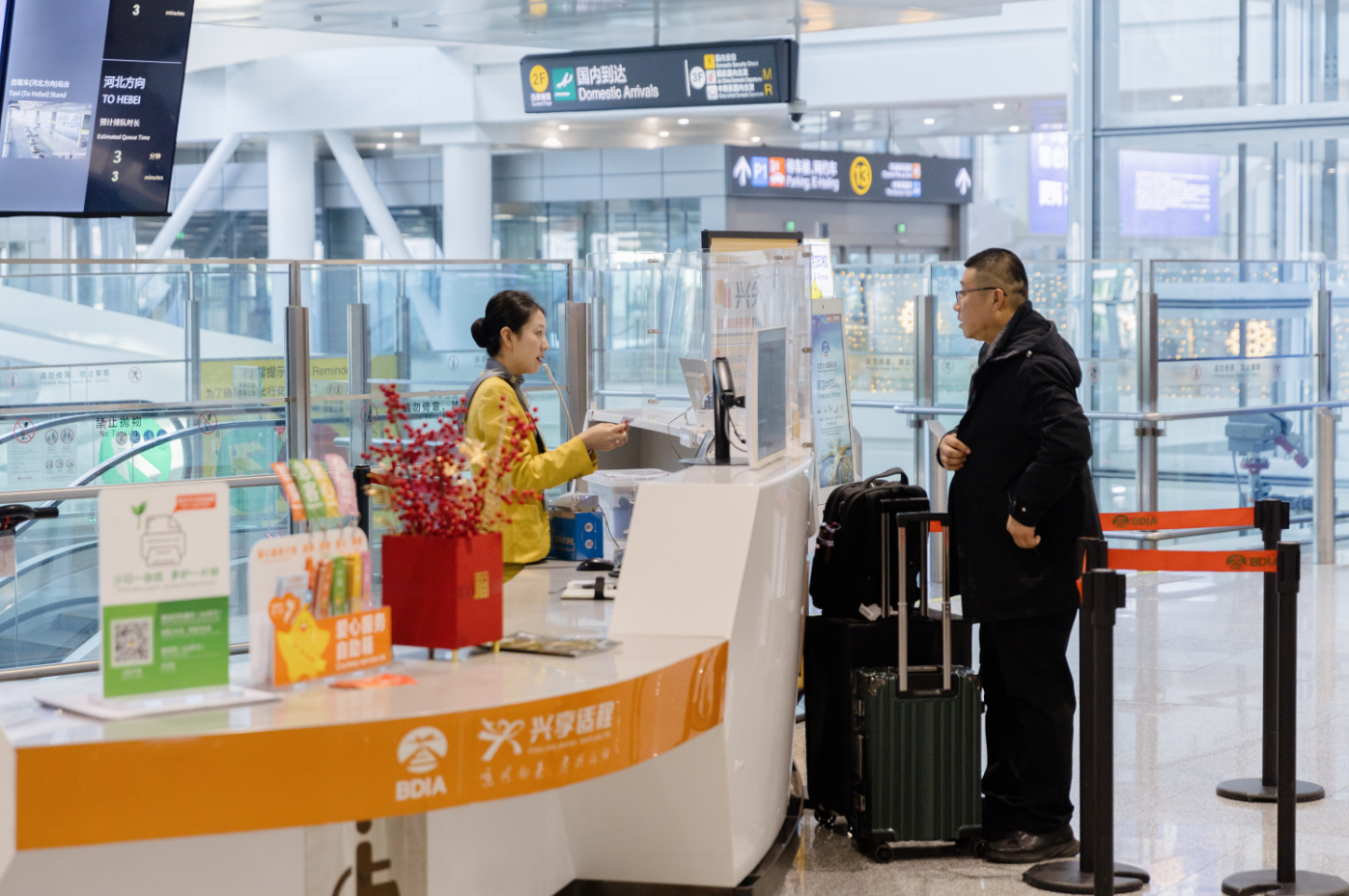 为做好春节运行服务工作,确保节日期间航班运行平稳顺畅,有效应对冬季可能出现的降雪、低能见度等特殊天气,大兴机场提前周密部署,加强运管委平台及除冰雪前方指挥部密切协调联动,精准开展航班动态调整,优化资源调配机制,强化应急处突能力;持续做好“兴心相印”爱心服务,积极开展“问讯帮扶、爱心专区、爱心手环、乡音伴行、夜间服务”等各项服务,增派服务大使、志愿者在航站楼出入口、值机柜台、安检、进港行李厅等关键流程点位引导保障,助力旅客平安、便捷、温馨出行。