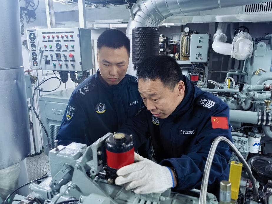 “有事找老张!”这句话,无疑是舰上让人心安的口头禅。在年轻执法员眼中,什么问题到了“老张”面前,便会迎刃而解。某次,一批关键配件深夜运抵,而舰艇翌日清晨必须出航。时间紧迫,在大家担心的目光中,张茹二话不说,抄起工具,带领机电班全员上阵。拆卸、清洗、安装、调试,机舱灯火通明,人影忙碌却井然有序。扳手与螺栓的敲击声配合“老张”简洁有力的指令,在深夜里汇成一首交响曲。当天色微亮,主机重新发出沉稳轰鸣,舰艇最终准时解缆出港。