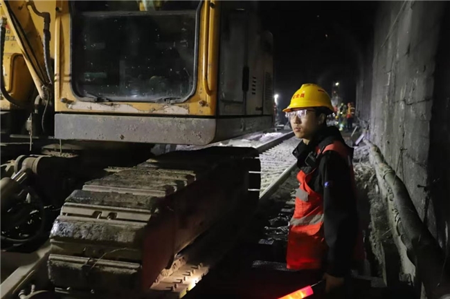 180分钟天窗作业时间,是施工不可突破的底线。为在有限时间内最大化推进施工进度,米易东桥路维修工区班长、挖机组负责人余王麒结合多年天窗作业经验,量身定制精准作业路径:作业前与施工负责人陈坤精准对接,明确挖机作业方向、平车运输顺序,实现人、机、料有序调配;天窗结束前60分钟,挖机提前撤离核心作业区集中清理废渣,既充分发挥机械效能,又确保线路准时准点开通,全力保障春运期间线路运输秩序。
