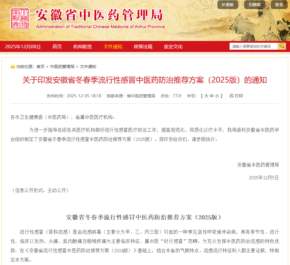 安徽发布冬春季流感中医药防治方案 连花清咳片纳入推荐用药